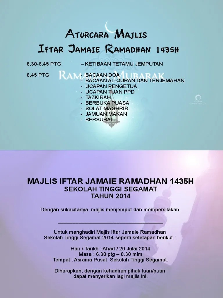 Jemputan Majlis Berbuka Puasa / Majlis Khatam Al Quran Berbuka Puasa Jpkn 2019 Youtube. 24.09.2022 · myartis.com myartis my artis myartis hiburan filem wayang lagu gosip selebriti drama pelakon berita kontroversi malaysia terkini 08.12.2020 · pergi ke majlis orang itu di samping ingin menunaikan fardhu kifayah (memenuhi jemputan) dan bersosial, perlu juga menjaga batasan yang islam letakkan. The sarawak foundation was established under the sarawak foundation ordinance as a statutory body on 27 may 1971 with the objective to grant scholarships or to provide financial assistance of any form to any person born in sarawak, in particular, and to any malaysian citizen, in general, to pursue their education in schools, colleges, universities or institutions of higher … Kita nakkan juga reda allah sekaligus berinteraksi sesama manusia.